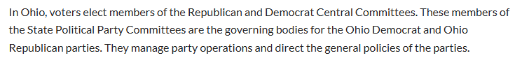 If you’re not familiar with what a Central Committee is, think of it like the Board of Directors of a political party. Here’s an Ohio-specific description, from League of Women Voters: