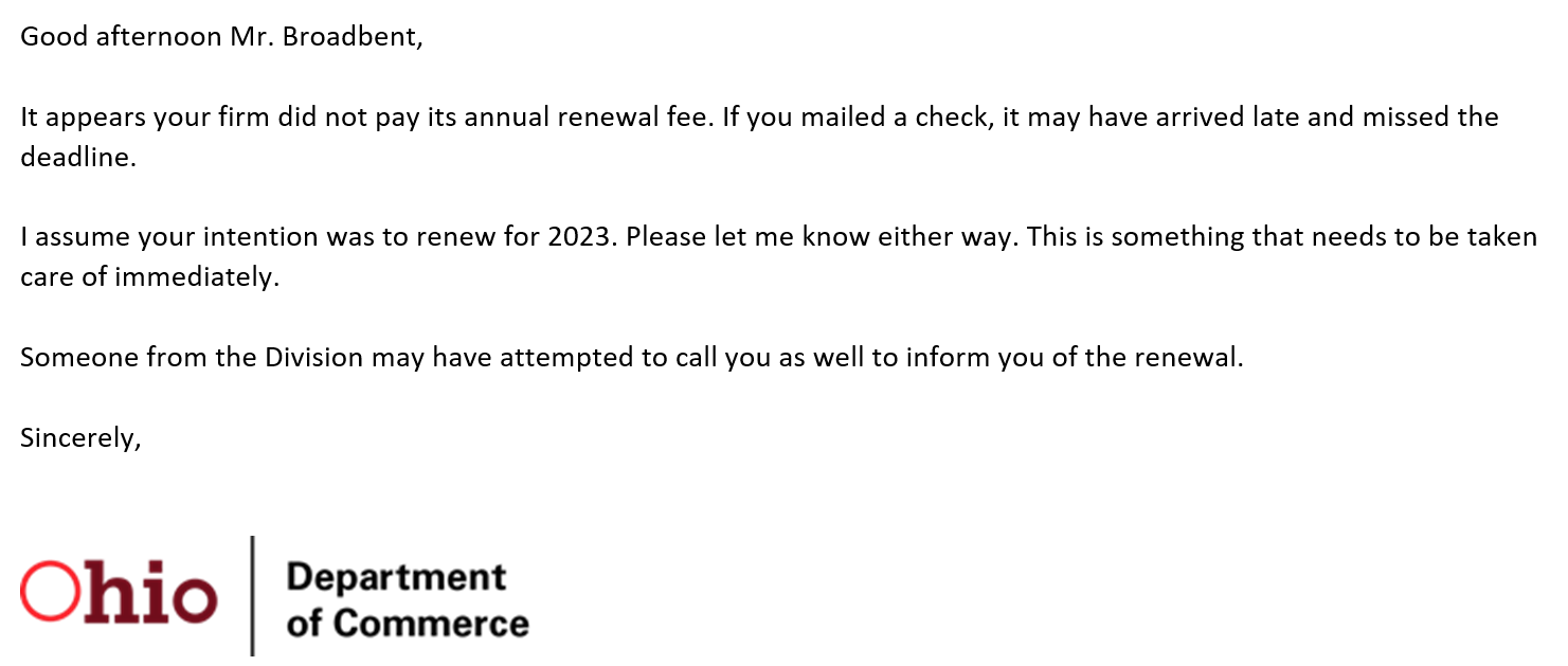 One of about one hundred communications I’ve received from Ohio Regulators this year. This came to me AFTER I’d already over-paid to renew my firm’s registrations.